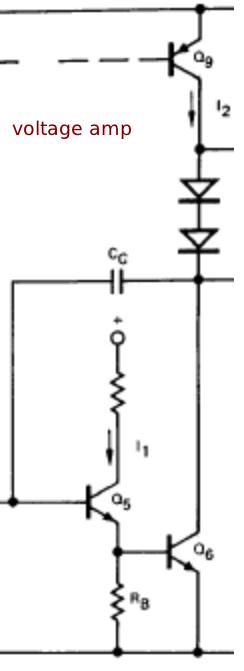 The second stage (VAS) is driven by the collector current of the noninverting input transistor. Between the diff amp and the VAS transistor, the waveform does not exist as a voltage signal, but as a current, Keep this in mind, You won’t see much in the way of voltage variations if you measure this signal with an oscilloscope, and even if you do, they will seem to look very distorted. . These current variations are translated by the VAS back into a voltage waveform. Here, on the collector of the VAS is where signals reappear in the form of an amplified voltage. In the example of FIG04, there’s actually a “composite” transistor being used, but it usually exists as a single transistor with the emitter connected to the rail, and the base going to the collector of the input transistor. You will also notice a Compensation Capacitor (Cc in FIG04). This stabilizes the amplifier and keeps it from becoming a large oscillator (more about this later). Notice also that the load for the VAS transistor is a current source. In some amplifiers, this can be a simple resistor, or a “Bootstrap” which is a pair of resistors and a capacitor used to increase the load impedance of the VAS as well as extend the voltage swing. There will be a whole section about current sources. The current source is used here as a high impedance load for the VAS, yet it can supply the required amount of current for the VAS (unlike a large value resistor).