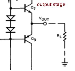 The output stage is a voltage follower buffer. As such it usually has no voltage gain, but has a high current gain.The diodes shown set a bias voltage to keep the output transistors partially turned on. Otherwise, there would be a gap near the zero crossing of the output voltage where there is no output at all. This is called “Crossover Distortion”. In an audio amplifier, the output transistors have low value (0.47 ohms or less) emitter resistors to improve thermal stability, The diodes are usually replaced with a transistor “adjustable zener” circuit, with the transistor thermally coupled to the output transistors. This bias circuit reduces the bias as the temperature rises, at the same rate that the Vbe of the output transistors decreases. This keeps the output transistors from going into thermal runaway and burning out. From the common tie point of the emitter resistors of the outputs is taken the output signal that drives the speaker. The feedback signal is also tapped off at this point.