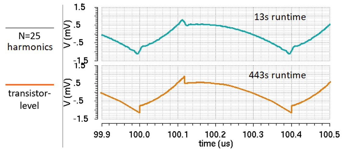 Applying a reconstruction with N=25 harmonics captures the non-linear ripple shape caused by parasitics with near-perfect fidelity to a full transistor-level simulation. Crucially, this method achieves a 35x speedup (13 seconds vs. 443 seconds) with an accuracy loss of only 1.3%.