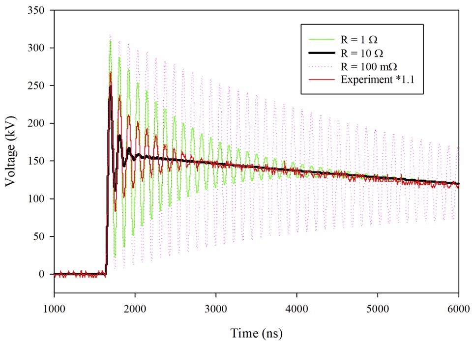 This error is clearly visible in Figure 3, which compares the simulation and experiment for a Marx Generator discharge. Ideal switch models (dotted lines) produce massive, undamped ringing that persists far longer than reality, while the parametric model (red line) accurately predicts the natural damping.
