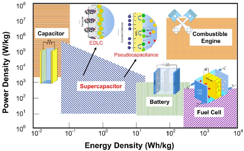 To understand the utility of a supercapacitor, one must first analyze the Ragone plot, which maps specific energy (Wh/kg) against specific power (W/kg). As indicated in Figure 1, supercapacitors occupy a distinct region between capacitors and batteries.