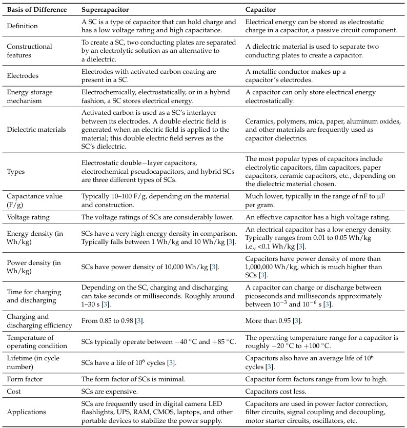 This separation yields capacitance values orders of magnitude higher than electrolytic capacitors, though with a lower breakdown voltage. Table 1 summarizes these technical distinctions.