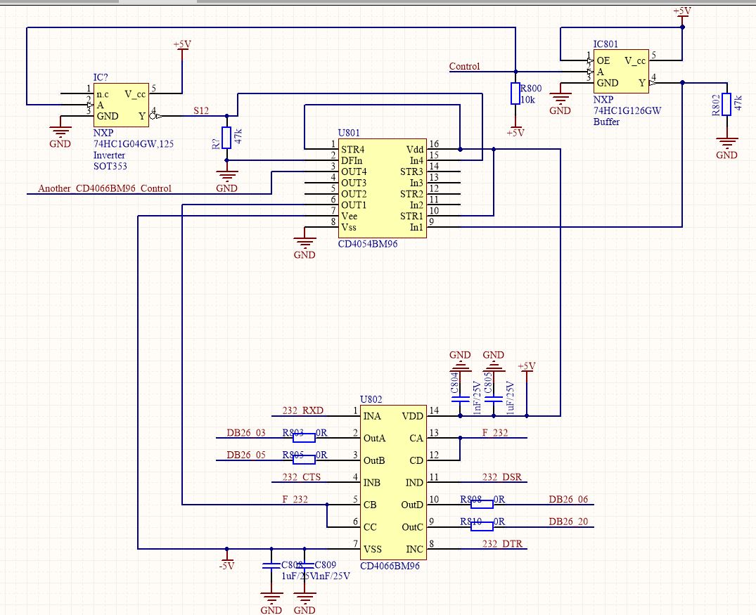 What’s wrong with my RS232 switch ON/OFF circuit? – For switch ON/OFF RS232 signals, I used CD4066, and because my control signal is TTL level, I have to use CD4054 to convert 0V/5V TTL signal to +5V/-5V signal to control CD4066 ON or OFF. But unfortunately, the circuit doesn’t work, and the total current is about 0.8A and CD4054 is fried. Why? Read more